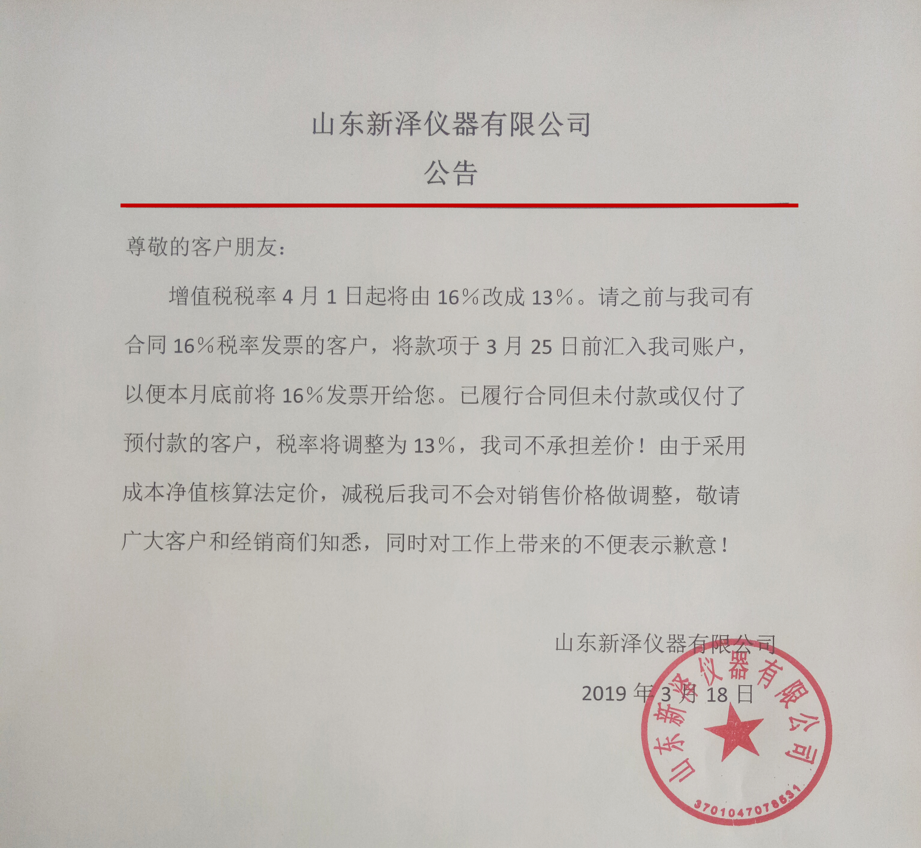 新澤公告:廣大客戶朋友,請(qǐng)注意增值稅稅率由16%降至13%