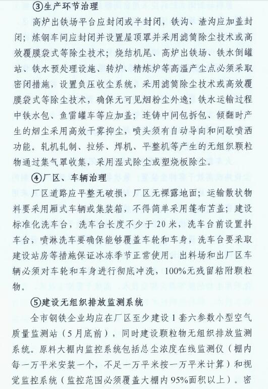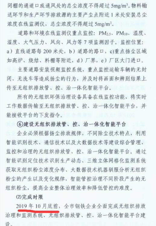 2、2019年10月底前,全市鋼鐵企業(yè)全面完成無組織排放治理和監(jiān)測、無組織排放管、控、治一體化智能平臺建設(shè)。