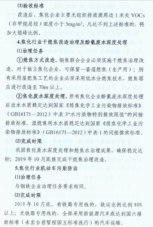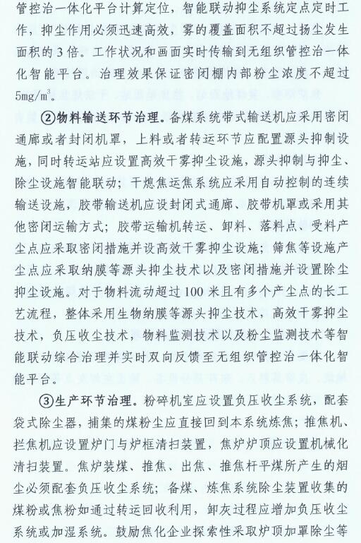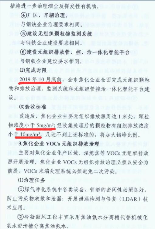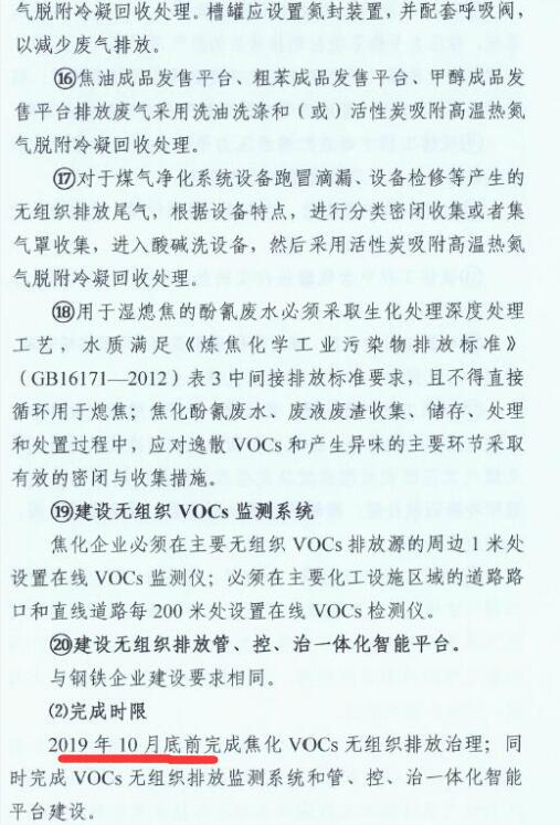 2、2019年10月底前,全市焦化企業(yè)全面完成無組織排放治理和監(jiān)測、無組織排放管、控、治一體化智能平臺建設(shè)。