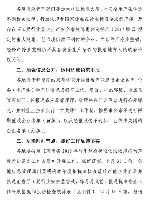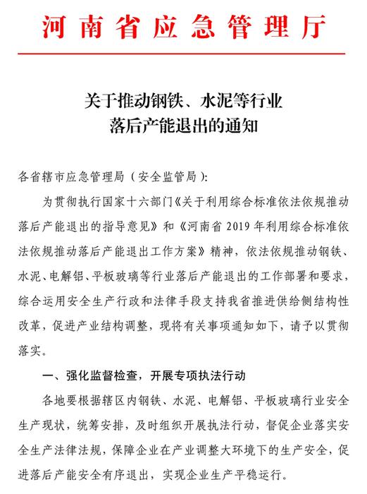 4月25日,河南省應(yīng)急管理廳下發(fā)《關(guān)于推動(dòng)鋼鐵、水泥等行業(yè)落后產(chǎn)能退出的通知》?!锻ㄖ访鞔_表示將利用安全生產(chǎn)行政和法律手段推進(jìn)水泥、鋼鐵等行業(yè)落后產(chǎn)能退出。《通知》要求各級(jí)應(yīng)急管理部門要加大執(zhí)法檢查力度,對(duì)安全生產(chǎn)條件達(dá)不到相關(guān)法律、行政法規(guī)和國家標(biāo)準(zhǔn)或行業(yè)標(biāo)準(zhǔn)要求的產(chǎn)能,及存在《工貿(mào)行業(yè)重大生產(chǎn)安全事故隱患判定標(biāo)準(zhǔn)(2017版)》規(guī)定的重大隱患,經(jīng)治理仍然不到位的企業(yè),立即停業(yè)停產(chǎn)整頓;經(jīng)停業(yè)停產(chǎn)整頓仍不具備安全生產(chǎn)條件的提請(qǐng)地方人民政府予以關(guān)閉。