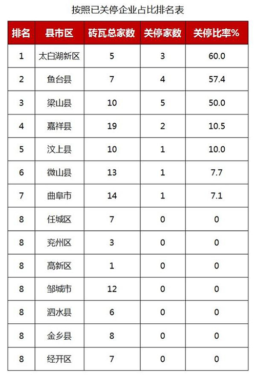 目前,濟寧市磚瓦企業(yè)整合重組工作穩(wěn)步推進,122家磚瓦企業(yè)中,17家企業(yè)已關(guān)停,包括曲阜1家,魚臺4家,梁山5家,汶上1家,太白湖3家,嘉祥2家,微山1家;105家企業(yè)處于前期,其中任城7家,兗州3家,高新1家,曲阜13家,鄒城12家,泗水6家,微山12家,魚臺3家,金鄉(xiāng)8家,嘉祥17家,汶上9家,梁山5家,太白湖2家,經(jīng)開區(qū)7家;按照已關(guān)停企業(yè)占比進行排名,排在前三名的縣市區(qū)為太白湖新區(qū)、魚臺縣、梁山縣,關(guān)停占比分別為60.0%、57.4%、50.0%。
