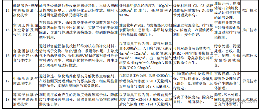 在這些技術(shù)中,有幾項(xiàng)特別引人注目。例如,低溫吸收-級(jí)配材料吸附油氣凈化技術(shù)、空調(diào)工件表面真空除油及回收利用技術(shù)被歸類(lèi)為推廣技術(shù),這意味著這些技術(shù)已經(jīng)具備了廣泛的應(yīng)用基礎(chǔ)和良好的市場(chǎng)前景。而冷凝-吸附-催化油氣回收凈化技術(shù)、官能團(tuán)接枝改性纖維凈化惡臭氣體技術(shù)、生物法惡臭氣體治理技術(shù)和等離子體耦合噴淋洗滌惡臭治理技術(shù)被列為示范技術(shù),顯示了這些技術(shù)在創(chuàng)新性和應(yīng)用潛力上的優(yōu)勢(shì)。