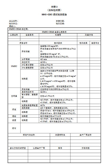 9.3.3驗(yàn)收?qǐng)?bào)告技術(shù)指標(biāo)驗(yàn)收測(cè)試報(bào)告應(yīng)包括以下信息:a)報(bào)告標(biāo)識(shí)-編號(hào);b)檢測(cè)日期和編制報(bào)告日期;c)NMHC-CEMS標(biāo)識(shí)-制造單位、型號(hào)和系列編號(hào);d)包括在系統(tǒng)中的NMHC-CEMS的主要組件(如氣體檢測(cè)器、流速CMS等);e)安裝NMHC-CEMS的企業(yè)名稱和安裝位置相關(guān)污染源名稱;f)環(huán)境條件記錄情況(大氣壓力、環(huán)境溫度、環(huán)境濕度);g)示值誤差、分析周期、系統(tǒng)響應(yīng)時(shí)間、零點(diǎn)漂移和量程漂移驗(yàn)收引用的標(biāo)準(zhǔn)及技術(shù)指標(biāo)要求;h)準(zhǔn)確度驗(yàn)收引用的標(biāo)準(zhǔn)及技術(shù)指標(biāo)要求;i)可溯源到國(guó)家標(biāo)準(zhǔn)的標(biāo)準(zhǔn)氣體;j)參比方法所用的主要設(shè)備、儀器等;k)檢測(cè)結(jié)果和結(jié)論;l)測(cè)試單位;m)三級(jí)審核簽字;n)色譜分析儀出廠檢測(cè)原始譜圖復(fù)印件;o)驗(yàn)收測(cè)試結(jié)果和驗(yàn)收測(cè)試報(bào)告,格式參照HJ75附錄F;7p)備注(技術(shù)驗(yàn)收單位認(rèn)為與評(píng)估NMHC-CEMS性能相關(guān)的其他信息)。技術(shù)指標(biāo)驗(yàn)收完成后編制技術(shù)指標(biāo)驗(yàn)收?qǐng)?bào)告,技術(shù)指標(biāo)驗(yàn)收結(jié)果應(yīng)達(dá)到本標(biāo)準(zhǔn)表1的要求。