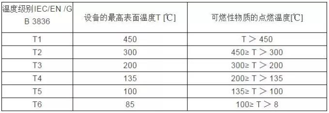 這是與氣體點(diǎn)燃溫度有關(guān)的電氣設(shè)備(假定環(huán)境溫度為40℃時(shí))的最高表面溫度,點(diǎn)燃能量與點(diǎn)燃溫度無(wú)關(guān)。
