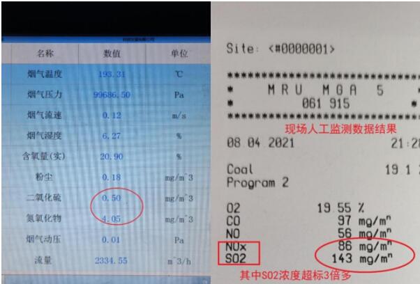 企業(yè)煙氣在線監(jiān)測系統(tǒng)的日常運維交給第三方山西世紀天源環(huán)保技術有限公司負責。督察發(fā)現(xiàn),運維公司通過在線監(jiān)測數(shù)據(jù)造假等方式,掩蓋恒達公司偷排和嚴重超標排放的違法事實。煙道煙溫是判斷旁路煙氣是否偷排的重要指標,但運維公司人員在日常運維中一直上報煙溫監(jiān)測設備存在故障,認為數(shù)據(jù)失真,而對煙氣二氧化硫、氮氧化物濃度長期低于10毫克/立方米的異常情況熟視無睹,裝聾作啞。經(jīng)現(xiàn)場人工監(jiān)測,煙氣實際二氧化硫和氮氧化物排放濃度分別為143毫克/立方米和86毫克/立方米,其中二氧化硫濃度超過《煉焦化學工業(yè)污染物排放標準》3.8倍,與此同時在線監(jiān)測數(shù)據(jù)卻顯示二氧化硫、氮氧化物濃度分別為0.50毫克/立方米和4.05毫克/立方米,數(shù)據(jù)嚴重失真,存在造假行為?!鲌D7 在線監(jiān)測數(shù)據(jù)(左圖)顯示二氧化硫和氮氧化物濃度分別為0.50毫克/立方米和4.05毫克/立方米;而現(xiàn)場人工監(jiān)測數(shù)據(jù)(右圖)顯示二氧化硫和氮氧化物實際濃度分別為143毫克/立方米和86毫克/立方米。在線監(jiān)測數(shù)據(jù)嚴重失真,存在造假行為。