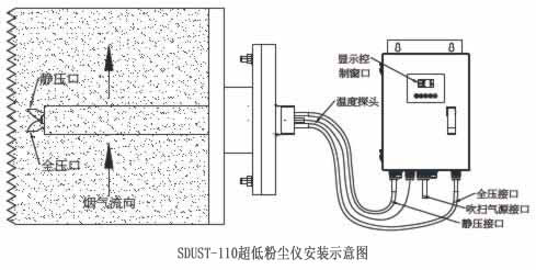 SVPT-100型煙氣"S"皮托管流速儀是基于傳統(tǒng)皮托管的差壓測量原理設(shè)計的。采用"S"型皮托管檢測頭,測量時 將皮托管探頭插入管道中,并使探頭中心軸線處于過流斷面中心且與流線方向一致,探頭全壓測孔正 對來流,靜壓測孔背對來流,分別將全壓靜壓傳遞給傳感器,傳感器測得差壓值即動壓。此動壓值與 煙氣流速有關(guān),流速大則動壓大,無流速時動壓為零。從而根據(jù)計算公式由動壓、煙氣氣體常數(shù)、煙 氣溫度、皮托管修正系數(shù)等計算出流速數(shù)值。其中皮托管修正系數(shù)由風(fēng)洞試驗測量得出。
