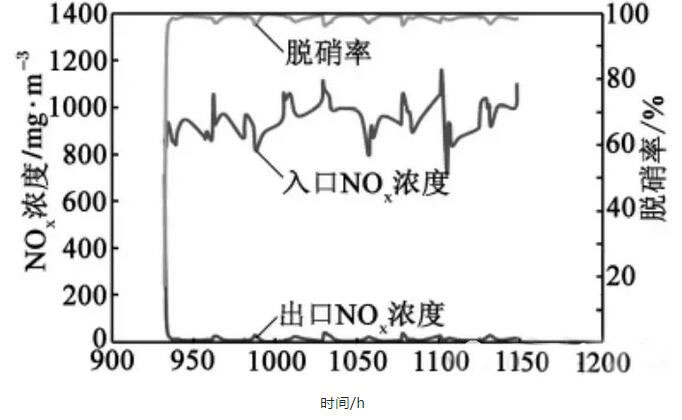 使用該類型的催化劑即使在入口NOx濃度很高時(2000~3000mg/m3),也可達(dá)到很高的NOx脫除精度,反應(yīng)后尾氣中氮氧化物濃度可低于150 mg/m3。如排放標(biāo)準(zhǔn)進(jìn)一步升級,不需對催化劑和反應(yīng)裝置做任何改動,只需稍微增加氨投入量,提供反應(yīng)所需的氨量,即可使尾氣中NOx濃度小于所規(guī)定的排放限值。