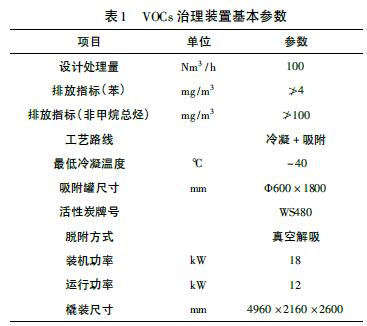 老罐區(qū)苯罐采用江蘇金門能源裝備有限公司設(shè)計(jì)、制造的JM - VRECS - CD/AD - 100 型VOCs 治理裝置,冷凝+ 吸附集成工藝,裝置主要參數(shù)如表1。