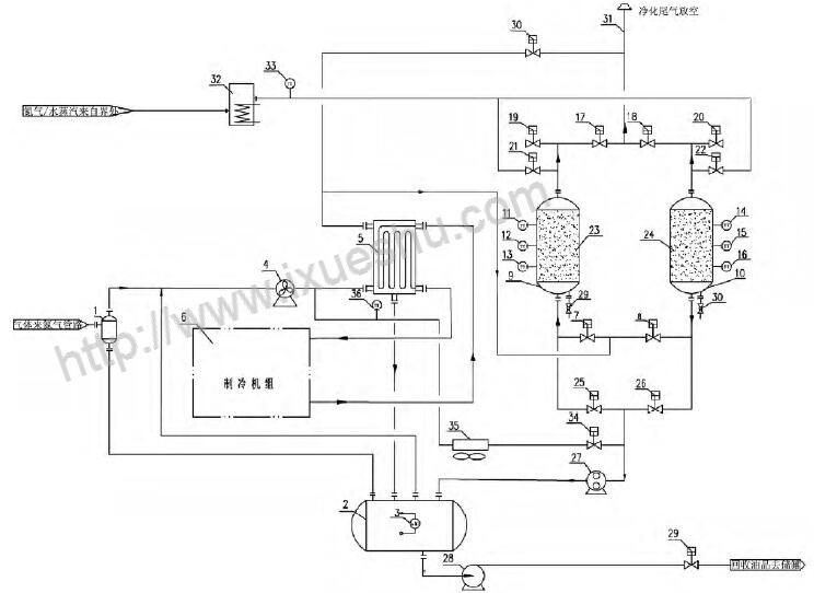 1 - 凝液收集罐; 2 - 氣液分離罐; 3 - 液位變送器; 4 - 風(fēng)機(jī); 5 - 冷箱; 6 - 制冷機(jī)組; 7 - 吸附罐進(jìn)口閥A; 8 - 吸附罐進(jìn)口閥B; 9 - 吸附罐A; 10 - 吸附罐B; 11 - 溫度變送器A; 12 - 溫度變送器B; 13 - 溫度變送器C; 14 - 溫度變送器D; 15 - 溫度變送器E; 16 - 溫度變送器F; 17 - 吸附罐出口閥A; 18- 吸附罐出口閥B; 19 - 吸附罐破真空閥A; 20 - 吸附罐破真空閥B; 21 - 吹掃氣進(jìn)口閥A; 22 - 吹掃氣進(jìn)口閥B; 23 - 吸附劑床層A; 24 - 吸附劑床層B; 25 - 真空脫附閥A; 26 - 真空脫附閥B; 27 - 真空泵; 28 - 回液泵; 29 - 外輸液流量開關(guān)閥; 30 - 緊急放空閥; 31 - 排放筒; 32 - 加熱器; 33 - 熱氣體溫度變送器; 34 - 熱氣體脫附開關(guān)閥; 35 - 冷卻器、36 - 冷卻溫度變送器