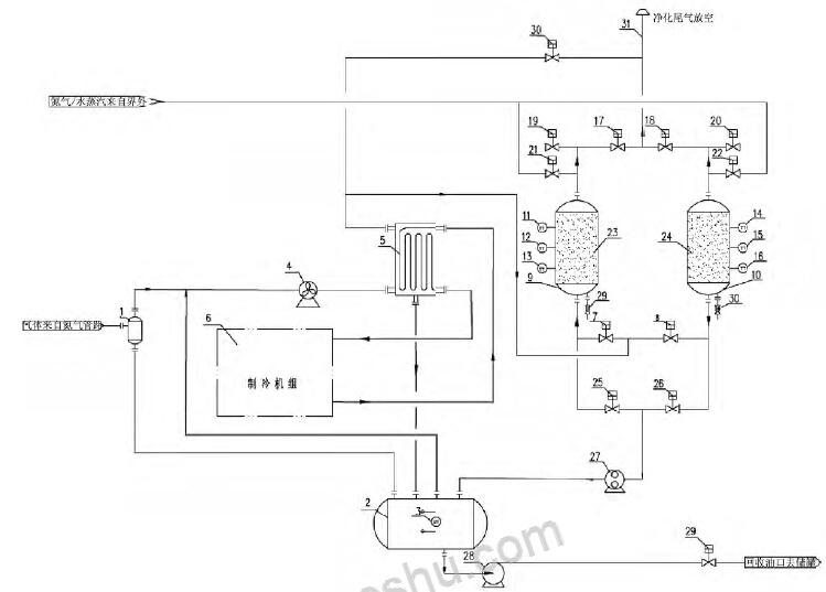 1 - 凝液收集罐; 2 - 氣液分離罐; 3 - 液位變送器; 4 - 風(fēng)機(jī); 5 - 冷箱; 6 - 制冷機(jī)組; 7 - 吸附罐進(jìn)口閥A; 8 - 吸附罐進(jìn)口閥B; 9 - 吸附罐A; 10 - 吸附罐B; 11 - 溫度變送器A; 12 - 溫度變送器B; 13 - 溫度變送器C; 14 - 溫度變送器D; 15 - 溫度變送器E; 16 - 溫度變送器F; 17 - 吸附罐出口閥A; 18- 吸附罐出口閥B; 19 - 吸附罐破真空閥A; 20 - 吸附罐破真空閥B; 21 - 吹掃氣進(jìn)口閥A; 22 - 吹掃氣進(jìn)口閥B; 23 - 吸附劑床層A; 24 - 吸附劑床層B; 25 - 真空脫附閥A; 26 - 真空脫附閥B; 27 - 真空泵; 28 - 回液泵; 29 - 外輸液流量開關(guān)閥;30 - 緊急放空閥; 31 - 排放筒