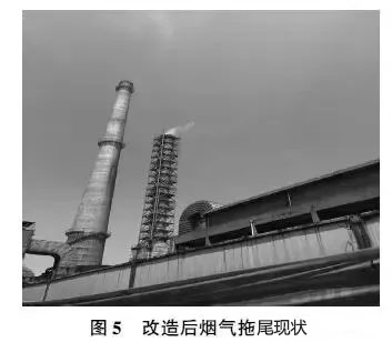 裝置改造后,經(jīng)抽樣分析出口煙氣平均氨逃逸質量濃度<5mg/m3、液滴質量濃度<70mg/m3,均達到設計規(guī)范要求。煙氣拖尾程度得到極大的改善(見圖5)。