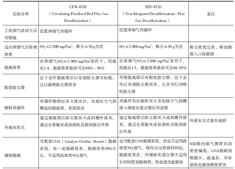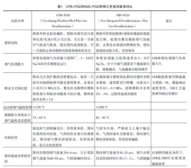 煙氣循環(huán)流化床CFB-FGD、 NID-FGD兩種半干法脫硫除塵治理工藝技術體系對比見表1。